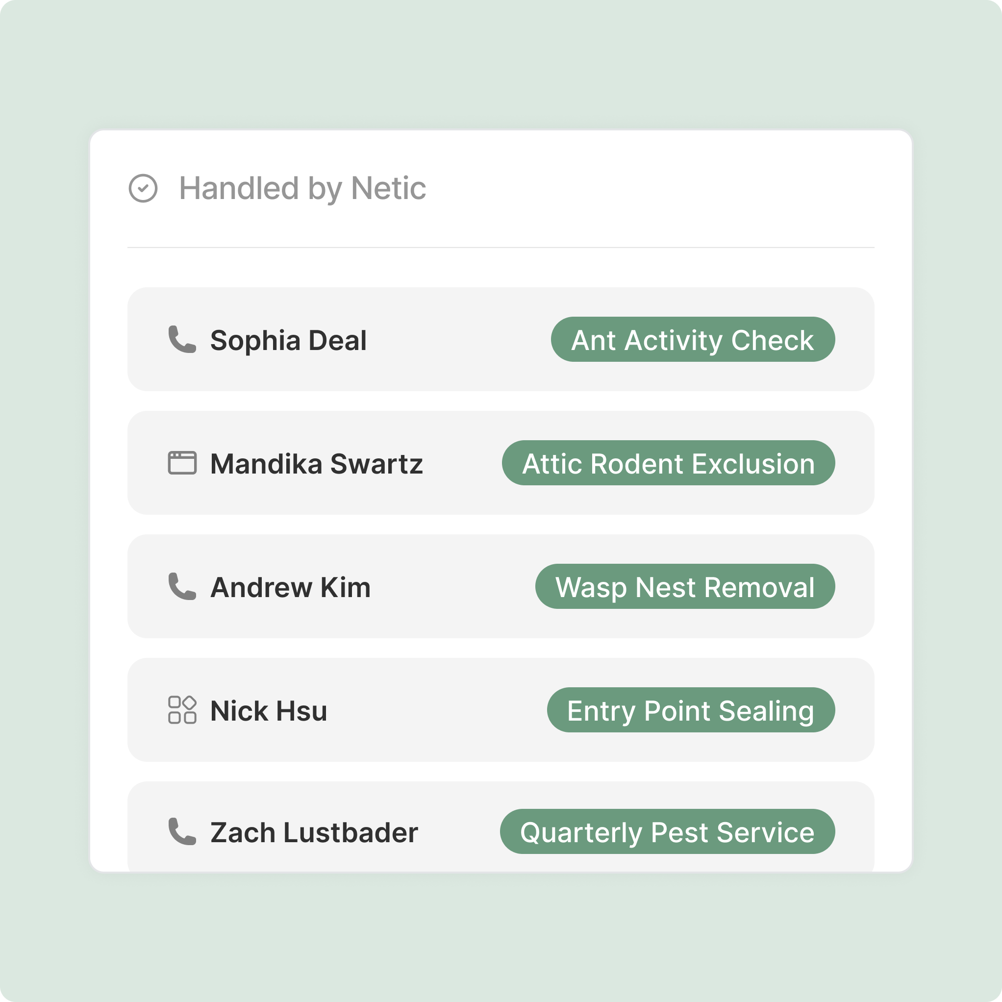 Netic manages inbounds, auto-runs outbound marketing, optimizes scheduling & dispatching, and provides real-time analytics to improve your operations immediately.